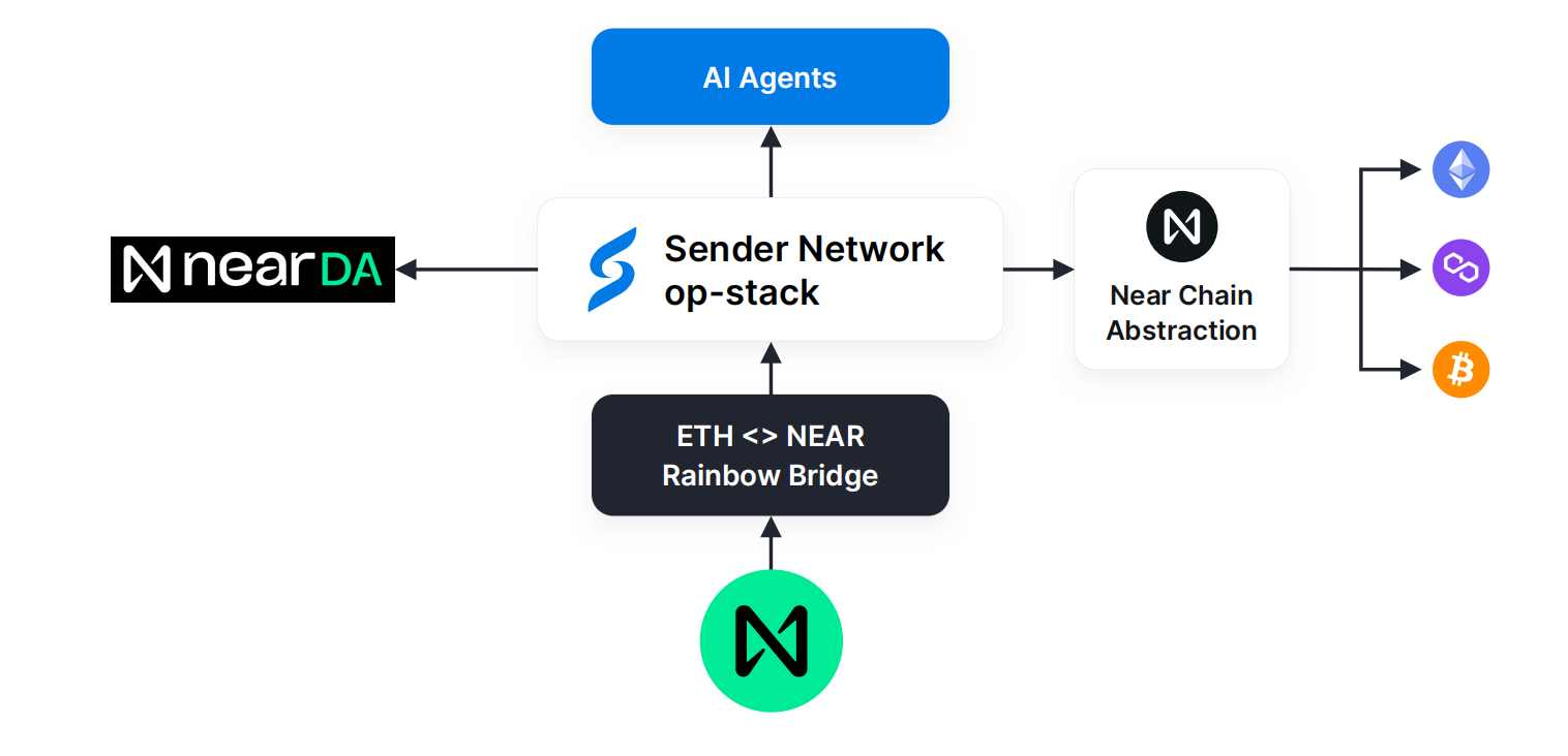 Sender Network is an innovative Layer 2 solution that cleverly combines the efficient framework of OP Stack with advanced features of the NEAR chain. It inherits Optimism's advantages of high speed, low Gas fees, and high efficiency, while integrating NEAR's data availability (DA) and chain abstraction. This unique combination not only provides excellent performance and user experience but also creates an ideal environment for AI Agent collaboration.